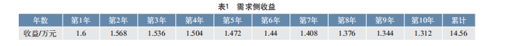 在需求侧响应方面,假设每年有20天参与需求侧响应,每天放电2h,总放电量为4000kW·h,以4元/kW·h计算,年收益为1.6万元。见表1,考虑电池余能每年衰减2%,在10年内的累计需求侧响应收益为14.56万元。