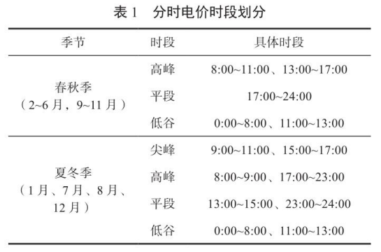 为了提高电力资源的利用效率,多年前我国许多地区就开始实行峰谷分时电价政策:不同用电时段的电价不同。这一政策的出发点是充分发挥市场作用,促进社会资源的合理配置,实际应用中就是鼓励用户合理安排生产时段、调整用电负荷,削峰填谷。当前浙江省的电价政策是根据用电负荷将春秋季的每天划分为高峰、平段和低谷三个时段,将夏冬季的每天划分为尖峰、高峰、平段和低谷(含深谷)四个时段,见表1,各时段执行不同的电价见表2。由表1和表2可见,既使执行一般工商用电电价标准,服务区的用电高峰与政策规定的高峰时段基本一致,因此服务区的电价至少是平段电价的1.5倍。