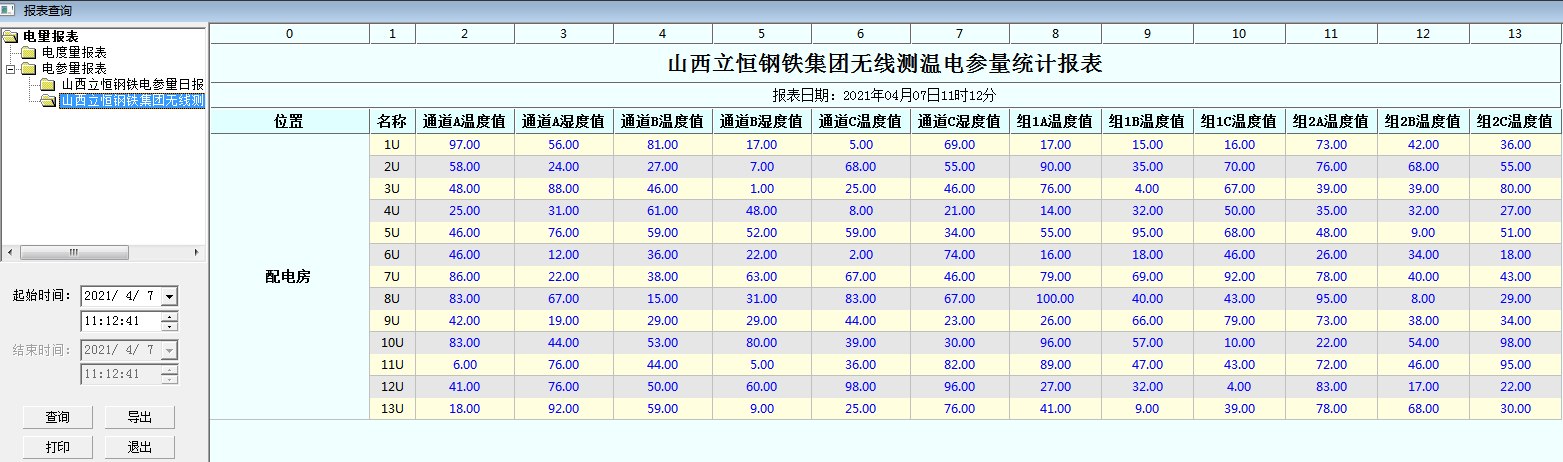 3)运行报表:查询及打印各测温点时间的温度数据。