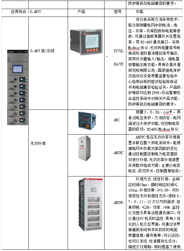 (1)电力监控主要针对10/0.4kV地面或地下变电所,对变电所高压回路配置微机保护装置及多功能仪表进行保护和监控,对0.4kV出线配置多功能计量仪表,用于测控出线回路电气参数和用能情况,可实时监控高低压供配电系统开关柜、变压器微机保护测控装置、发电机控制柜、ATS/STS、UPS,包括遥控、遥信、遥测、遥调、事故报警及记录