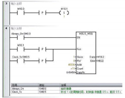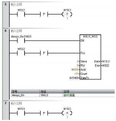 图5程序段二首先对第一台电力仪表调用MBUS_MSG指令启动对从站的请求并处理响应。设置好从站的地址、读写模式、需要读取的寄存器起始地址、需要读取的寄存器数量以及PLC内部存储数据的V寄存器地址指针。每隔0.5s对两台电力仪表进行一次数据读取。