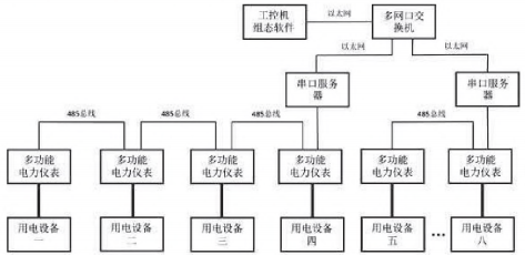 完成硬件布置后,需对软件进行设置。软件设置包括对串口服务器进行设置,设置好串口服务器的虚拟串口号、IP地址、通讯方式等;在组态软件中建立与电力仪表对应的多台通讯设备,并设置通讯方式、校验方式、地址、波特率等,再建立相应寄存器变量,从而获取电力仪表中的数据。在组态软件界面中可对获取到的数据进行显示并绘制成曲线、棒状图或饼状图等。电力仪表电气原理图见图2。