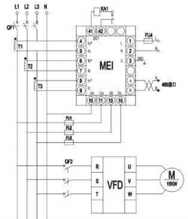 图1所示为方法一对应的系统框图。对每台设备增加电流互感器和多功能电力仪表,通过多功能电力仪表采集设备的电流电压,多台多功能电力仪表通过RS485总线连接,接至串口服务器(串口转以太网服务器),将串口服务器通过以太网接至多网口交换机,再连接工控机。图2为单台多功能电力仪表电气原理图,负载为一台变频器驱动的电机。三相电经空开接至变频器输入端,T1、T2、T3为电流互感器 ,接至该电力仪表的电流检测输入端。通过从三相母线上取电结点,再经熔断器接至该电力仪表电压检测输入端。电力仪表的报警输出立而口接中间继电器KA1线圈,利用中间继电器KA1的常开或常闭触点实现过电压过电流等实时报警功能。该电力仪表的RS458接口通过通讯线缆与其他多功能电力仪表的RS485接口连通,共同组成RS485总线网络,通过MODBUS RTU协议实现数据的远程通讯功能。
