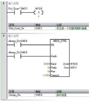 采用SMART 200 PLC编写梯形图子程序[2],对两台多功能电力仪表通过MODBUS RTU通讯协议实现电力数据的读取,PLC作为MODBUS RTU的主站,两台电力仪表作为从站。图4为程序段一,第一个扫描周期先对各状态位复位,然后调用MBUS_CTRL指令完成初始化,设置好通讯模式、波特率、校验方式、端□号、超时时间等。