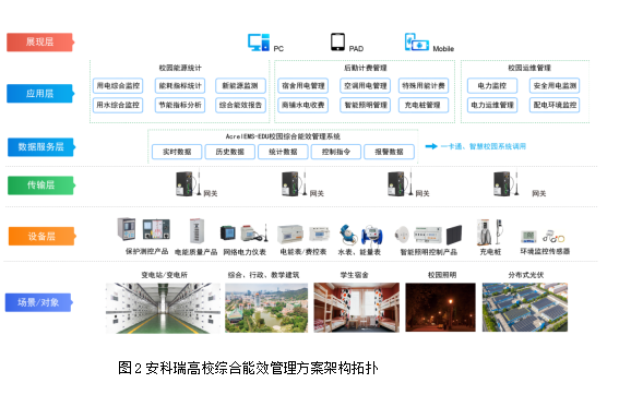 AcrelEMS-EDU校园综合能效管理解决方案针对校园能源统计、后勤计费管理、校园运维管理等提供高校的信息化管理平台。从“源、网、荷、储、充"多个角度解析高校当下及未来的用能问题及用能需求,在统一的需求下“实现能源互补、信息互通"等管理模式。助力学校管理智能化、数字化、综合化,实现节能校园、绿色校园、低碳校园。