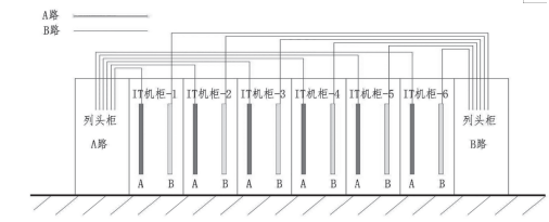 智能母线的供电方案在不间断电源(Uninterruptible Power System,UPS)出线柜之后不需要再敷设线缆或设置配电设备,而是直接串接智能母线槽,并配合接插单元为每台负载机箱内装置供电。数据中心智能母线采用树干式的供配电系统,每列机柜均通过两条母线槽供电,且地板下及机柜上没有电缆桥架,便于管理维修。列头柜供电系统如图 1 所示,智能母线供电系统如图2所示。
