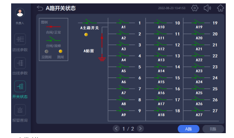 左侧一列为主路开关状态,主路跳闸SD状态、主路防雷开关状态、主路防雷故障点状态,默认为无源检测点,分闸为绿色,合闸为红色。主路右侧的皆为支路开关状态;默认为有源检测点,合闸为红色,分闸为绿色。