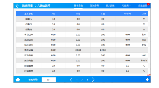 显示电压、电流、功率、电能等电参数数据,在设备地址旁边的输入框输入本箱子对应的仪表地址,即可实现对箱子中仪表数据的采集。