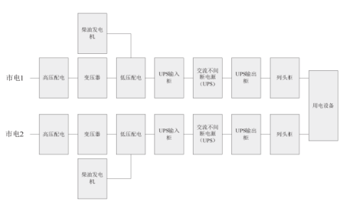 数据中心要实现持续稳定运行,前提是其供电系统应稳定可靠、不间断。当前,重要程度高的数据中心一般采用2N架构的UPS供电方式,以实现容错要求,供电系统包括高低压配电、后备发电机组、不间断电源、后备蓄电池、精密配电等子系统,典型的数据中心供电系统如图1所示。