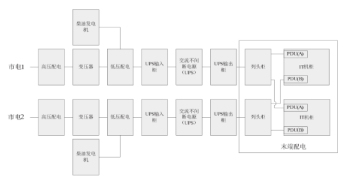 IT机柜的供电方式为:每个IT机柜内包括两路PDU,PDU(A)和PDU(B),其中PDU(A)通过电缆由列头柜A取电,PDU(B)通过电缆由列头柜B取电。