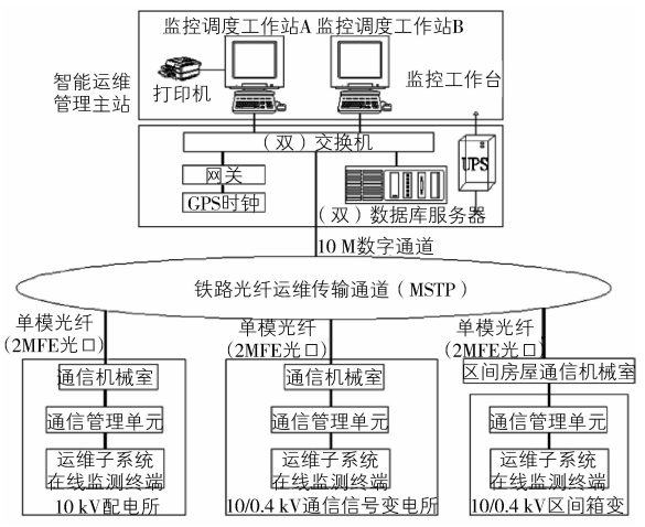 电力智能运维管理系统主站按照运营单位要求一般集中设置于供电段内,主要包括两套并行运行的监控调度工作站,用于管理和调度整个系统运行;为数据库系统的高性能运行提供硬件支持和保障的数据库服务器;具有多个通信输入/输出端口的信息集成网关,作为在线监测系统和主站平台之间的数据和命令交换;用于接收卫星对时的GPS时钟;为计算机系统供电的UPS电源,以及打印机、调度台等设备和系统服务软件,系统具备可扩展功能[3]。