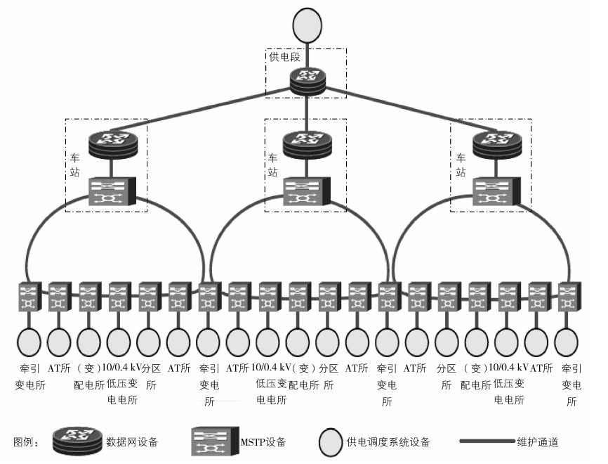 本系统的电力维护通道按照《铁路供电调度系统通信组网技术方案指导意见》(运电通信函(2012)428号)设置,如图2所示。系统设置1条通信通道,维护通道一个2Mb/s电路挂接终端站的数量不大于10个,维护通道利用传输系统接入层以太网通道,经车站(或通信站)的传输设备与数据网设备互连,在运行维护管理主站设置10M数字通道。