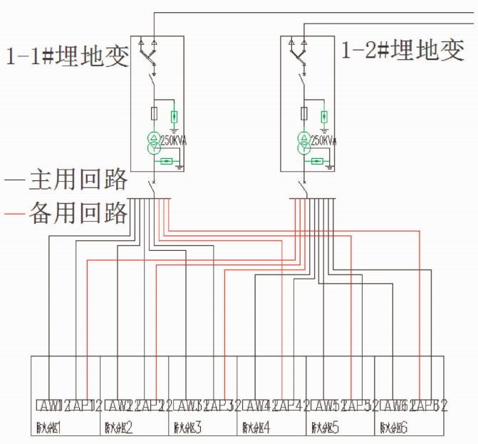 正常稳定的电力供应,是确保综合管廊内各附属配套设备安全可靠运行的重要前提。根据负荷对综合管廊安全运行的重要性,将综合管廊中的用电负荷分为二级负荷和三级负荷。其中,二级负荷主要包括消防设备、监控报警设备、应急照明设备、天然气管道舱的管道紧急切断阀、事故风机,其余用电负荷为三级负荷。根据二级负荷的供电要求,应采用双回路供电。当双回路无法实现时,应设置备用电源。新店外环路项目中供电系统设计如图2所示。