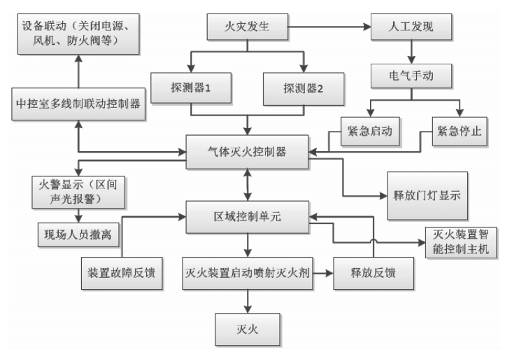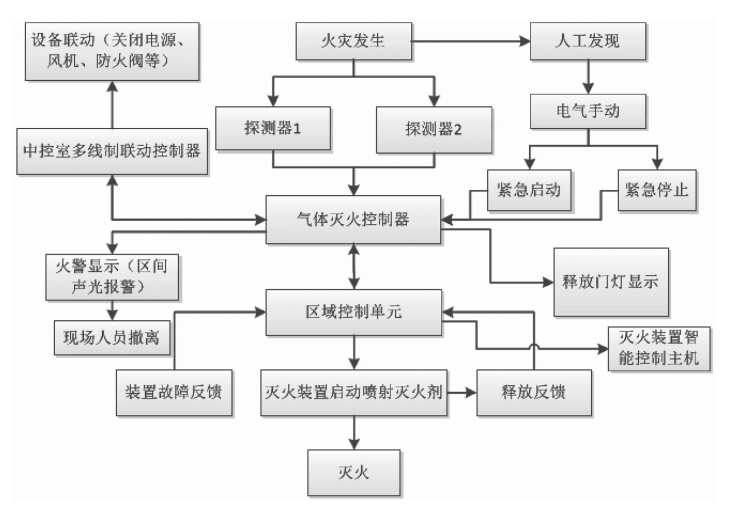 根据新店外环路综合管廊项目的实际需要,项目中火灾自动报警及联动系统由一台放置于弱电控制室的火灾报警联动主机和各防火分区内的区域火灾报警控制器与气体灭火控制器组成。主机与控制器通过1000Mbps快速以太环网相连接。在弱电控制室即可监测所有火灾报警信号和联动控制信号,并控制重要消防设备。系统具体的设备包括:火灾探测器、手动报警按钮、火灾声光报警器、消防专用电话、火灾报警控制器、感温探测主机、感温光纤、消防联动控制器、应急照明控制器、气体灭火控制器、防火门监控系统、消防电源监控系统、直流备用电源、弱电控制室图形显示装置等。以火灾发生到灭火为例,系统的主要工作原理如图3所示。