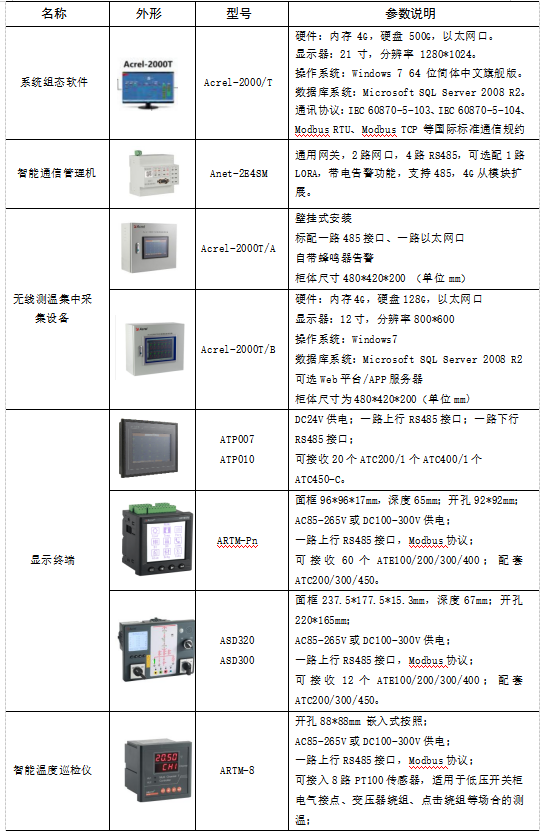 Acrel-2000T无线测温监控系统通过RS 485总线或以太网与间隔层的设备直接进行通讯,系统设计遵循国际标准Modbus-RTU、Modbus-TCP等传输规约,安全性、可靠性和开放性都得到了提高。该系统具有遥信、遥测、遥控、遥调、遥设、事件报警、曲线、棒图、报表和用户管理功能,可以监控无线测温系统的设备运行状况,实现快速报警响应,预防严重故障发生。