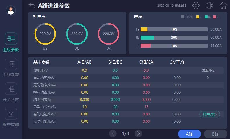 开机进入主页,包含进线参数、开关状态、出线参数、报警查询等功能,按按钮可进入各功能界面查看。