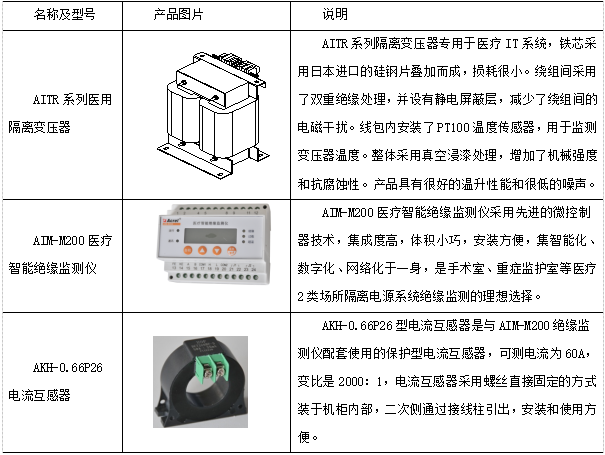 医用IT系统绝缘监测及故障定位产品(七件套)包括AITR系列医用隔离变压器、AIM-M200医疗智能绝缘监测仪、AKH-0.66P26电流互感器、AIL150-4/AIL150-8绝缘故障定位仪、ASG150测试信号发生器、HDR-60-24电源模块和AID150集中报警与显示仪等,产品如表1所示。