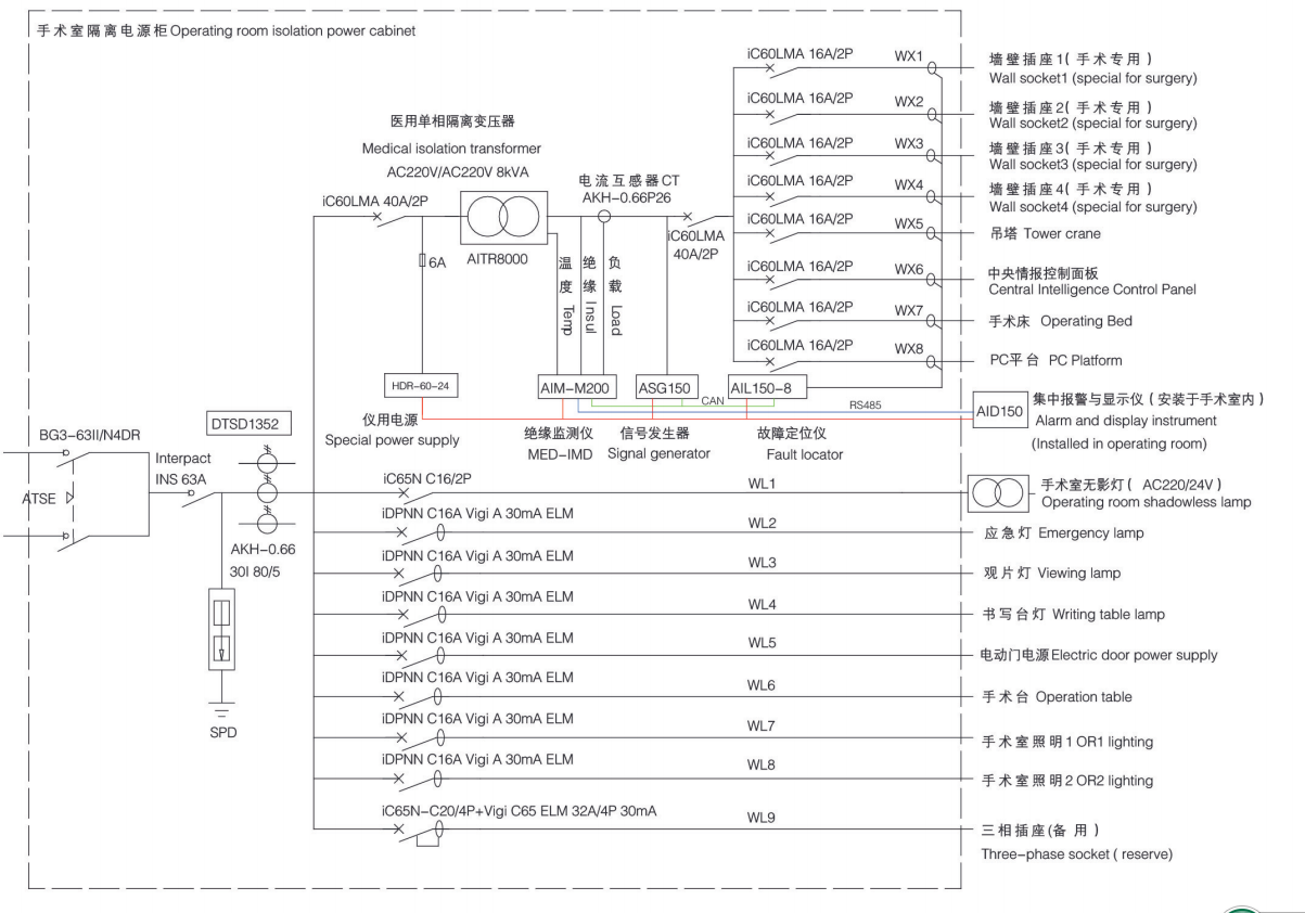 在医疗场所,所有的工作都集中在病人和他们的康复上。即使是短暂的断电会危及诊断和治疗,因而影响患者的健康。为此,对于电源可靠性的要求是非常严格的,所以医院电气安全可靠也引起来业界的重视。其中关于ICU、手术室等重要场合的配电安全可靠越来越引起业界重视。尤其是关于IT隔离电源的设置。GB16895.24-2005/IEC60364-7-710:2002标准中规定,在医疗领域2类医疗场所内,用于维持生命的、外科手术的和其他位于“患者区域"内的医疗电器设备和系统的供电回路应选用带绝缘监视的医疗IT系统供电。