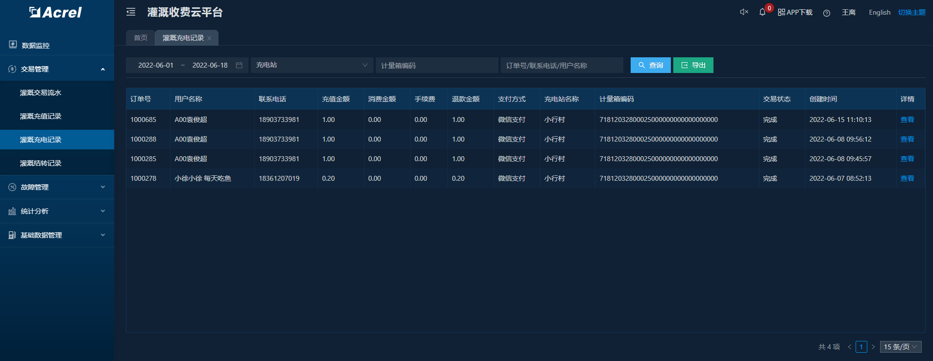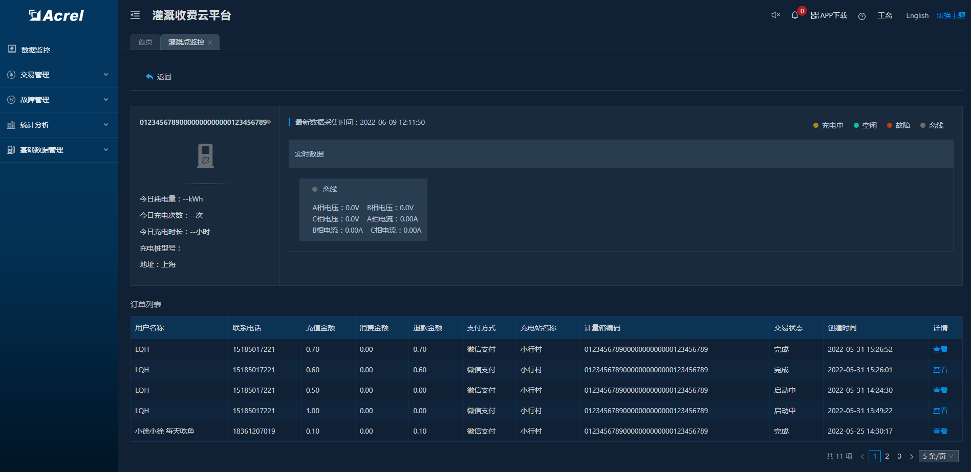 实时监控站点及计量控制终端设备的工作状态,统计充电数据,可对终端设备进行远程控制,支持查看历史充电数据。