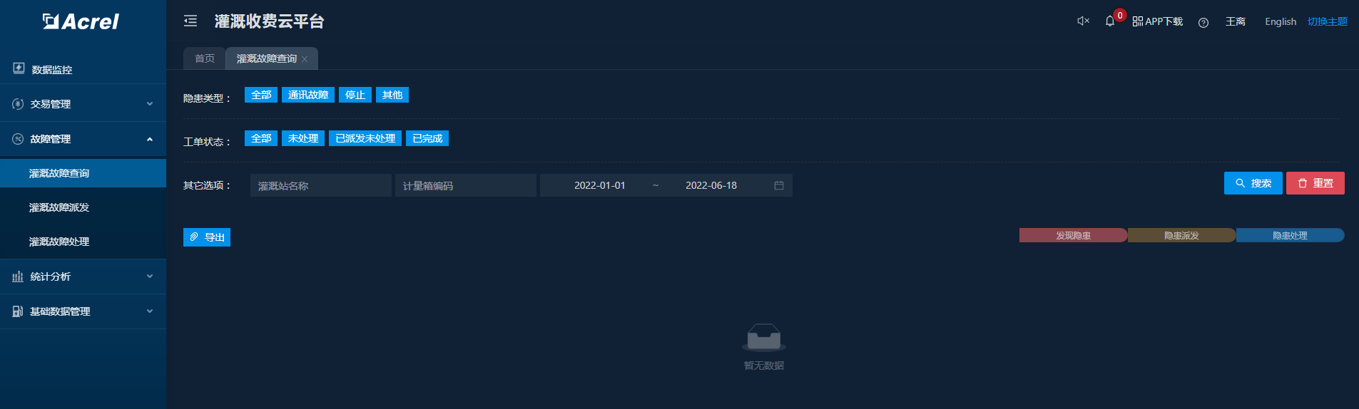 汇总计量终端故障信息及处理进度,可将故障工单派发给运维人员进行处理,处理完成后在平台中进行闭环操作,支持图片、文档、视频等附件上传。