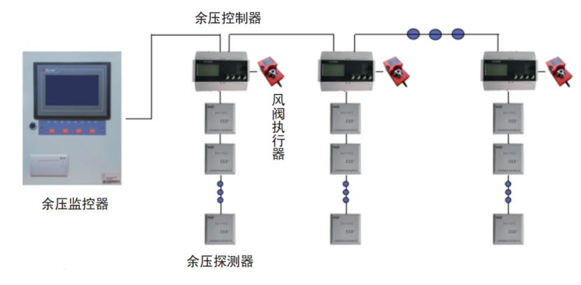 余压监控系统由余压监控器(主机)、余压控制器、余压探测器、风阀执行器、系统监控专用软件等部分或全部设备组成,系统组网如下图所示。