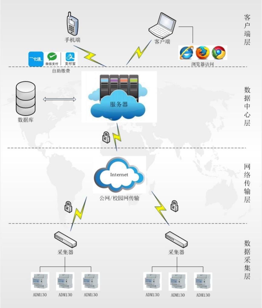 AcrelCloud-3100学生宿舍版预付费云平台是与ADM130(一进三出)或ADF300L(多回路计量箱)预付费电能表配套的云平台。它是以电能管理网站和集中抄表软件为主,包括服务器,通讯管理机在内的集成系统。针对高校宿舍这一特殊应用场合研发,主要实现电能监控、时间管理、恶性负载管理、预付费管理等在高校宿舍中存在的特殊需求。