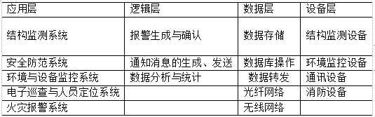 整个管道工程以完整的管道运营管理为主,是对设备和基础设施运营安全负责的特殊场所。综合管道监控警报系统大致分为4个层面:应用层(包 括综合管廊及其结构监控系统、安全隐患预防系统等、环境监控系统和设备、综合监控平台和系统、通信监控系统、入侵监控系统、火灾警报系统、监视系统之间的有效链接),业务逻辑层(确认警报产品的生成、生成通知信息、数据传输、数据分析统计、数据存储和生成)、数据访问层(数据访问、数据传输、数据存储、数据库操作)、设备层(对应各子系统的具体设备)%系统的整体结构见表1、图1。