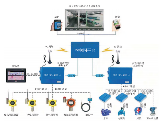 环境监测包括温湿度、烟感温感、积水浸水、可燃气体浓度、门禁、视频、空调、消防数据的采集、展示和预警,同时也可接入管廊舱室内的水泵和通风排烟风机等设备集成的第三方系统完成管廊环境综合监控。