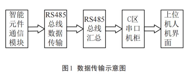 为了能够在光伏设备发生故障时快速定位故障点,在硬件上选用智能型的汇流箱、逆变器;使用组态软件构建一个界面,将每个智能元器件在界面上显示出来,通过RS485总线将数据汇总到机柜串口后,通过光纤与上位机进行连接从而实现监视功能。该系统实现数据采集和状态监控的同时,可进行简单、直观的人机交互。其中,数据采集、状态监控和简单的数据分析由各种智能元器件来实现,人机交互通过组态软件实现;在组态软件中建立监控界面,将实时数据导入其中进行分析处理,两者之间的连接通过建立在C区的串口机柜实现,数据传输示意图如图1所示。