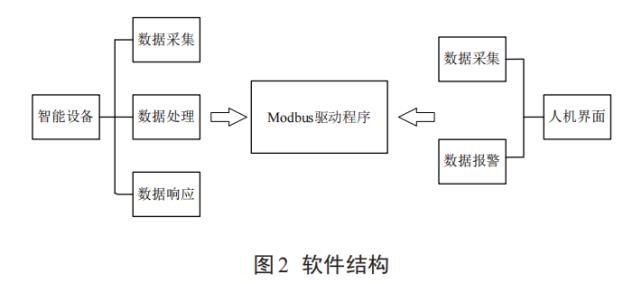 智能硬件系统通过Modbus驱动程序与上位机相连接,人机界面就可以显示设备数据的记录、数据报警等,系统软件结构如图2所示。