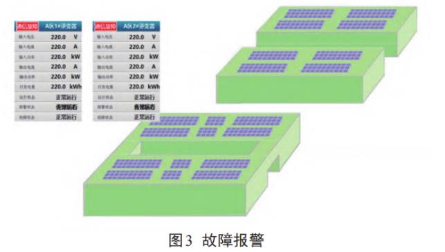 当设备发生故障,经过软件判断需要给予响应时,及时切换至该设备的故障界面,同时播放报警声音。逆变器发生故障时,系统主界面显示区域闪烁,使值班人员能够快速定位故障发生区域,系统故障报警显示如图3所示。