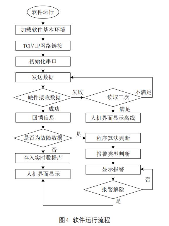 首先启动软件,加载完成软件基本环境后,TCP/IP进行网络连通,连接完成后初始化各个串口,根据地址向硬件设备发送数据。如果发送失败,则再连续尝试发送三次,如果仍然未能发送成功,则判断该台设备离线;如果成功,在智能设备接收数据信息后,将自身数据回馈至上位机,软件接收数据后存入实时数据库,并在人机界面读取数据。将各个串口互相连接通信并将历史数据加载读取。如果智能设备出现故障,将向系统发送故障数据,系统根据定义好的算法判断设备的故障类型,在界面上显示报警区域,在故障解除之后软件系统回到正常状态。流程图如图4所示。