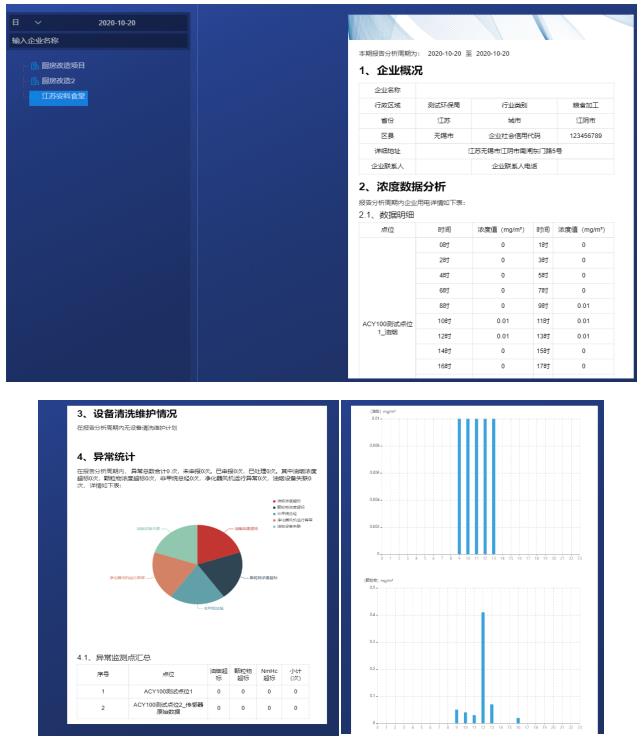对相关的采集数据油烟、颗粒物、NMHC数据进行关联分析,对超标的种类、企业进行饼状图的展示,同时对报警企业进行排名,根据排名情况对相关企业进行数据和运行状态的分析评价。