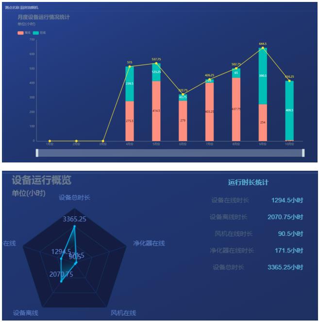 企业在线时长报告模块,将企业目前监测仪的在线时长,失联时长,风机、净化器的在线、离线时间进行汇总,以折线图、雷达图的形式展示。