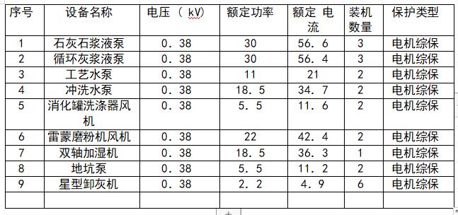 我司在河北某钢铁集团,燃气电站脱硫工程,对系统内重要工艺设备、潮湿环境的电机、重载设备均设计配备了电机综合保护器,见下表 :