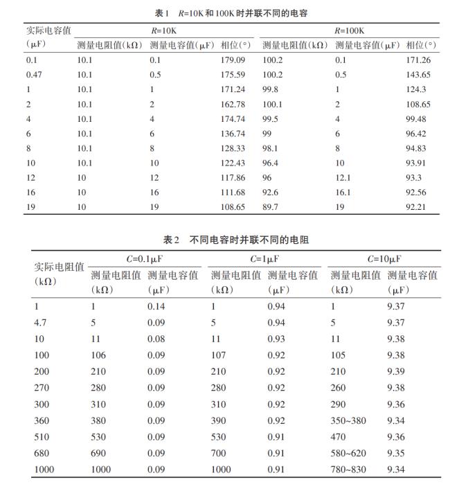 表2记录了电容在0.1μF,1μF,和10μF这三种情况下,并联不同电阻时的测试结果。