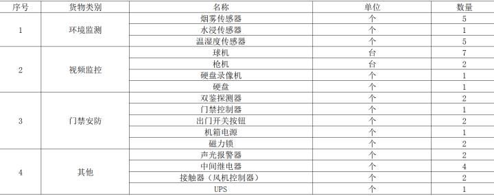 此次环境监测系统用于训练场正式用电工程,具体需求为:智能监辅助系统包括智监系统屏、采集前置机、UPS电源、视频监子系统(云合球机、球机)、环境监测子系统(温度、湿度、水浸、烟感)、控制子系统(灯光、空调、除湿机、风机)、门监子系统(读卡器、开门按钮、磁力锁)、安防监子系统(双鉴探测器)。