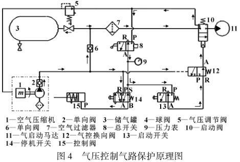 气压控制气路原理如图4所示,当压缩空气进入气控换向阀12控制气路,并通过压力作用切断启动开关13与启动阀10、气启动马达11之间的气路连接,此时启动开关13失去作用,即使按下启动开关13也不能使气启动马达11工作,只有操作人员按下停机开关14后,再次按启动开关13,气启动马达11才工作。首先从图中可以看出,此控制气路分支和连接点比较多,其次在工作过程中需要人为进行操作,这就导致马达使用时容易受限,工作效率严重降低,在应用中起不到实际效果。