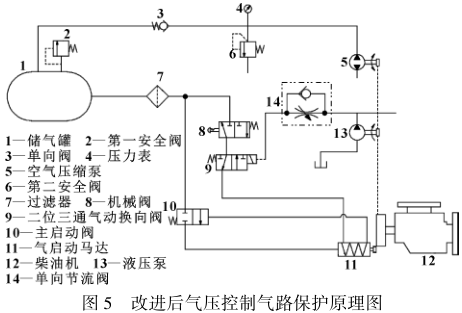 该控制气路分支和连接点明显减少,保护响应时间降低,同时整个过程中不需要人为进行操作,极大提高了工作效率。整个控制气路分两路:一路依次通过机械阀8、二位三通气动换向阀9连接气启动马达11的齿轮预啮合进气口;另一路通过主启动阀10与气启动马达11的进气口连接,气启动马达11的齿轮预啮合出气口通过管路与主启动阀10的控制口连接,柴油机12的飞轮通过传动机构与液压泵13的动力输入端连接,液压泵13的进液口与油箱连接,液压泵13的出液口通过管路及单向节流阀14与二位三通气动换向阀9的控制口连接。此外,空气压缩泵5的动力输入端通过传动机构与柴油机12的飞轮连接,空气压缩泵5的出气口通过管路与单向阀3的进气口连接,而单向阀3的出气口通过管路与储气罐1的进气口连接,为确保储气罐1安全,在储气罐1上设置安全阀2。由于需要实时监测管路的压力值大小,故在空气压缩泵5与单向阀3之间的管路上连接压力表4和安全阀6。