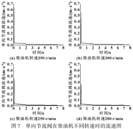 在上述参数条件下,通过设置柴油机的转速,观察单向节流阀的流速情况,流速如图7所示,启动柴油机后,节流阀的流速均迅速上升,达到峰值后迅速下降。当柴油机的转速由大变小时,单向节流阀的流速峰值随之变小。故当柴油机转速在300r/min以内时,通过控制节流阀的流速大小对整个气路进行控制,并将该信号传递给二位三通气动换向阀,该阀收到信号后立即切断控制气路,同时主启动阀关闭,达到保护柴油机齿圈和马达小齿轮的目的