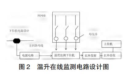 本次构建的温升在线监测电路,配备了3面柜子,在每个柜子当中设计的结构是含三响环氧套筒,设计的监测路数分别是10和9路,对每相母线相互连接位置的温升进行监测,实际温度为1路监测柜体内温度。结合开关柜所设置的配置,让测温路数增加,便于不同客户需求有效满足。在已经采集的温度,采用测温分机使用红外通讯方式,把数据传递到接受分机端中,通过RS485通信,将数据传递到主控电脑上。这就不需要监测人员实际到现场,只需要采用主控电脑就能监测整个环网柜系统温升情况,更加及时发现可能会存在的问题,预判事故,促进供电可靠性提升。图2为温升在线监测电路设计图。