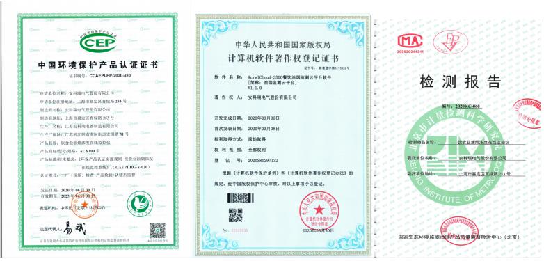 已经获取中国环境保护产品认证证书(中环协CCEP认证证书)并取得对应的软件测试报告《油烟浓度在线监测仪测试报告》,还取得计算机软件著作权。