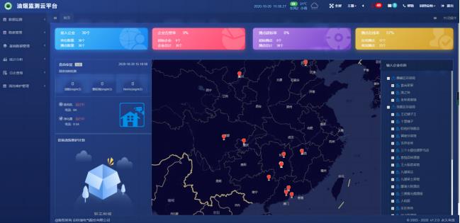 该页面通过分仓形式将云平台系统的所有基本信息全部展示在大屏上,主要包含了项目总览,企业隐患排名,报警信息列表,监测点位以及报警统计,监测点位地理位置,工单任务统计等。