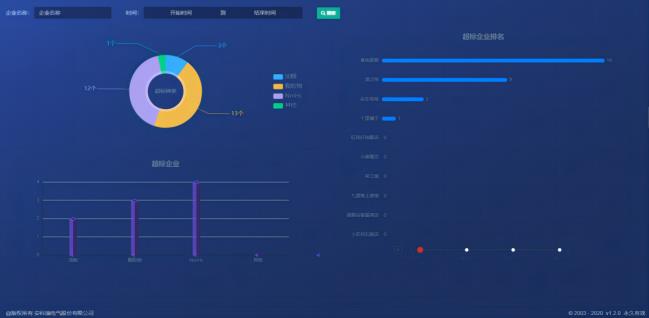 超标分析:对相关的采集数据油烟、颗粒物、NMHC数据进行关联分析,对超标的种类、企业进行饼状图的展示,同时对报警企业进行排名,根据排名情况对相关企业进行数据和运行状态的分析评价。