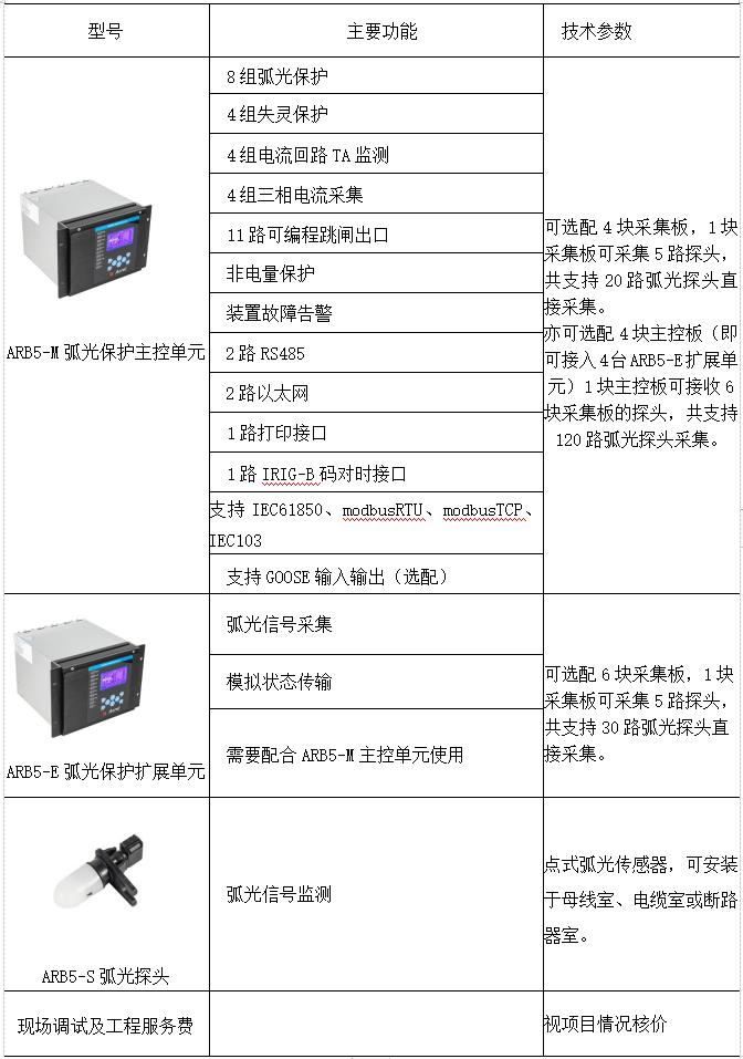 图1 弧光保护原理示意图3.2弧光的特点 人们选用这个保护系统,是由于它具有很多明显的优点:①它的原理简单、通俗易懂,保护结构简单,它在发生故障时,只需要检查开关柜内,然后,在同时检测弧光和电流增量,就会下达跳闸的指令;②能够更快迅速 地发现故障并起到保护作用,当出现电路故障时,应该用及时地去维修,而这个系统能最快的发现故障,以检测弧光信号和过流关闭为依据,从而可以实现保护的可靠动作,这个系统起到一个连锁反应,本身会连锁自我检查,如此就能够充分地保证整个系统的安全性以及可靠性;③能准确地找出故障点并准确定位,在发生故障时,它能够准确地找出故障点,并且能够准确地标记故障点的位置,能保证工作人员在维修时,能快速地找到故障位置,并且处理故障来恢复供电系统;④在断路器不起作用时,起到一个保护作用,在主断路失控的情况下,它可以发出一个指令,不受其他机器的控制,跳过上一级完成跳闸动作,从而提高系统的安全性与可靠性。这些特点,更好地说明了这个保护系统的*性,是保护中低压系统母线解决办法。4弧光保护系统与变压器后备过流保护的对比 弧光保护系统是专门用于来保护中低压系统母线的系统,它的动作时间快,相比于传统的保护系统,要更具有*性,它采用弧光和电流闭锁的方法来进行双重判断,增加了它的可靠性,从而对安全性能也有了一定的保障,它在发生故障时,能准确地定位,减少了维修人员查找的时间,大大减短了维修时间,从而来保障故障之后快速供电。 而变压器后备过流保护它也有优点,它不需要专门的1套装置系统,工作量较小,而且它不能像弧光保护系 统那样对故障点准确定位,耗费的时间长,并且可靠性低。总而言之,各有各的优点,但是从综合来看,弧光保护系统是比较理想的解决方法。5开云官方端网站登录入口ARB5-M弧光保护装置5.1产品选型说明ARB5-弧光主控单元