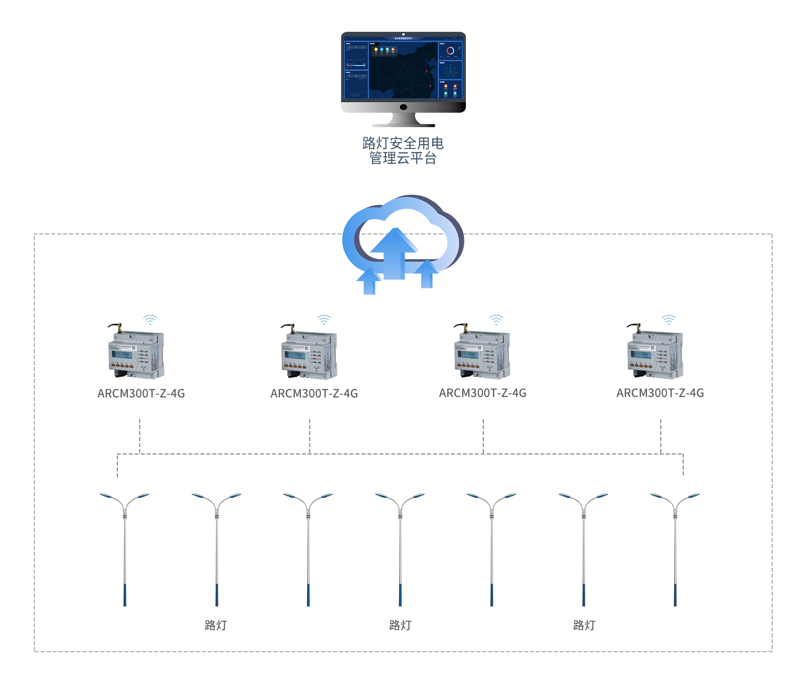 直接接入ARCM310仪表,监控每个路灯的电压、电流等电参量进行预警和报警,也可设置定时通断时间并远程控制路灯通断