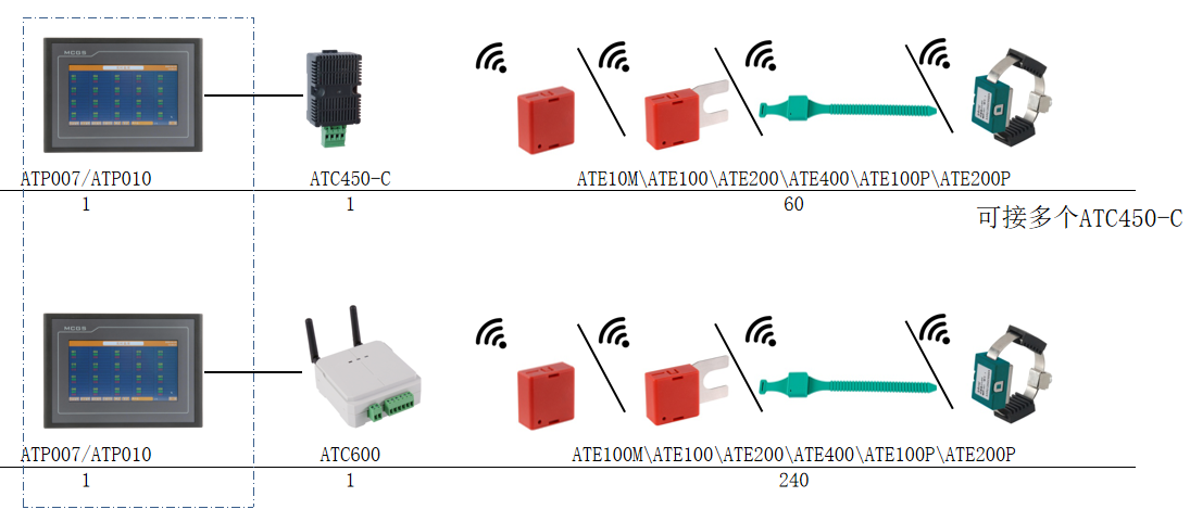 说明:Acrel-2000T/B不仅可以通过RS485连接多种ATC收发器接收所有型号传感器实现集中显示,还可以通讯连接配电室内无线测温相关就地显示装置实现集中显示,同时还可以连接配电室内智能操控、微机保护、电力仪表等电力监控设备进行监测。