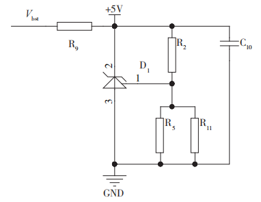 由于磁敏芯片的输出电压为供电电压的一半,因此为了使磁敏芯片获得精准的2.5V输出电压,需要为磁敏芯片提供精准的5V电压,故使用精密稳压电路将已经抬高的12V电压转换为精准的5V电压,为磁敏芯片供电,精密稳压电路原理图如图4。其中,D1为精密稳压电源芯片TL431,R9为限流电阻,用于限制后级电路电流,R2、R5以及R11为调压电阻,用于调节输出电压为精准的5V,精准的5V可以由分压电阻得到精准的2.5V。