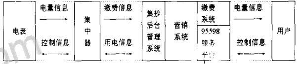 通过这个管理平台用户可以利用电话、手机网络等方式通过银行转账的形式,向供电企业预付电费。缴费系统收取用户电费后将电费信息等发送至营销系统营销系统根据该用户欠费信息等资料,进行电费核算将核算结果发送至集抄管理系统,并通过95598服务平台将购电信息反馈给用户。集抄管理系统再根据营销系统命令,将控制控制信息下载至集中器传递到终端电能表,电能表根据控制信息进行通断电操作,并将状态信息逐返回营销系统。