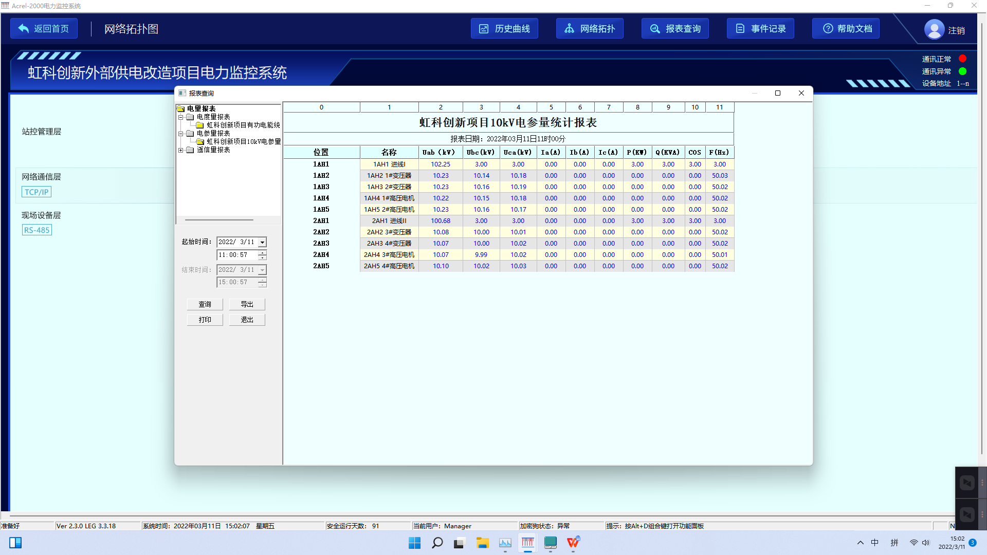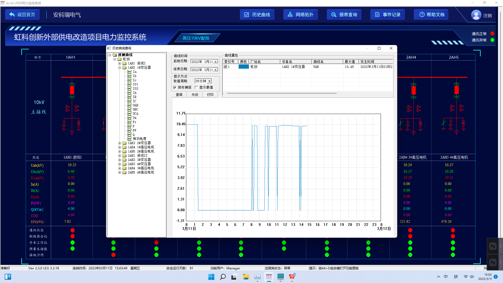 Acrel-2000电力监控系统可以直观显示一次系统图,并实时显示10kV电压等级各回路的遥测量、遥信量和报警信号等。遥测量包括电压、电流、功率、功率、电能等电参量等;遥信量包括中压开关柜内路断路器、手车、隔离开关、负荷开关、地刀开关的分合状态、断路器弹簧储能状态及远方就地控制状态;报警信号包括微机保护装置的告警信号、保护跳闸信号及装置异常信号。